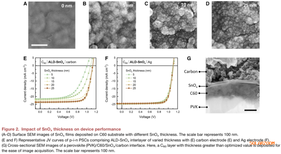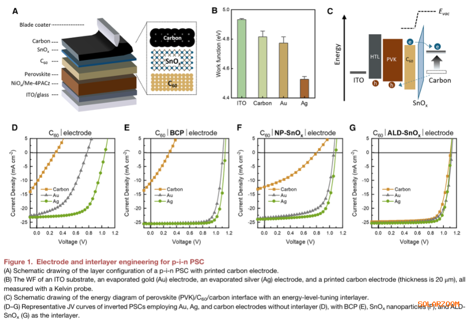 实现碳电极极性反转:通过原子层沉积(ALD)制备的氧化锡中间层,首次将碳从空穴收集阳极转变为电子收集阴极,解决了p-i-n结构中碳电极不兼容的长期难题。