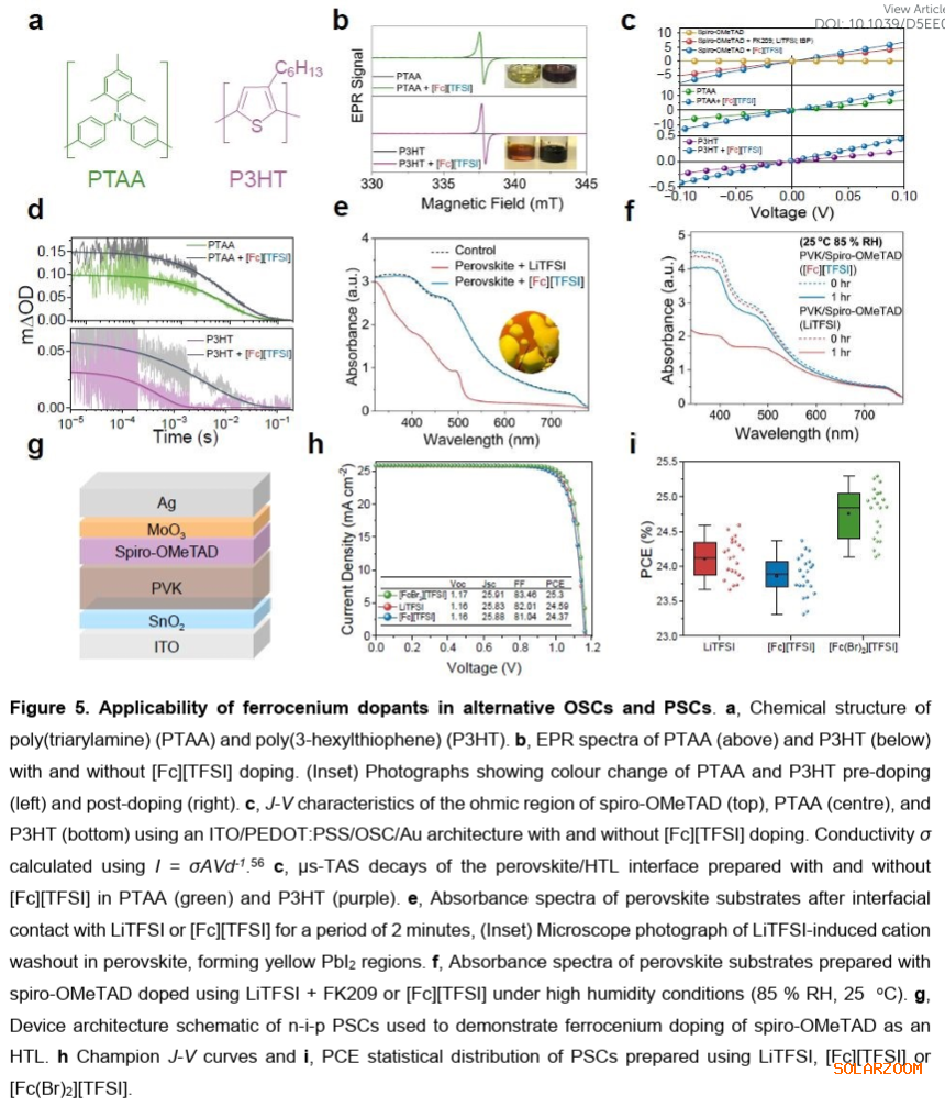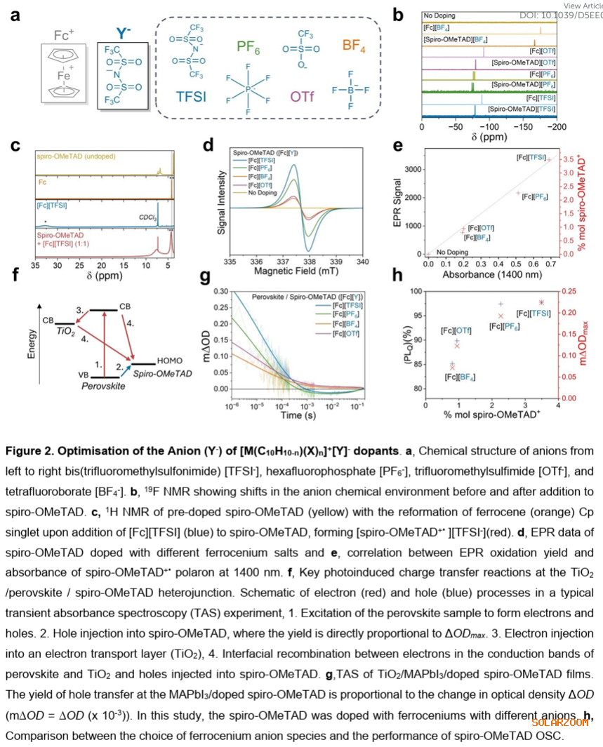 本文香港城市大学朱宗龙和伦敦帝国理工学院Saif A. Haque等人介绍了一类基于金属茂盐的通式化p型掺杂剂([M(C₁₀H₁₀₋ₙ)(X)ₙ]⁺[Y]⁻),能够满足上述要求。该方法的关键在于能够通过氧化还原活性金属阳离子(M)和环戊二烯环上官能团(X)独立调控阳离子,从而控制氧化强度;同时,通过对阴离子(Y)的调控,可以控制掺杂OSC⁺盐的掺杂效能和稳定性。本研究系统探究了阳离子和阴离子结构对OSC掺杂的影响,阐明了用于掺杂剂设计的结构-性能关系。我们揭示了掺杂机制,并证明此类掺杂剂可将钙钛矿/OSC异质结处的空穴提取效率提升45%。使用金属茂盐掺杂剂的钙钛矿/OSC光活性层,相比使用传统LiTFSI基掺杂剂的薄膜,对湿气诱导降解的耐受性显著增强。