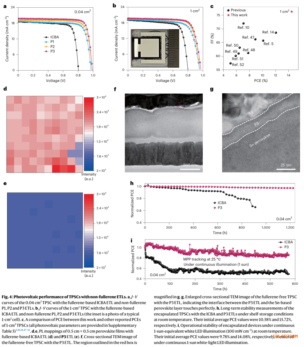 高效率与大尺寸兼备:采用非富勒烯ETL材料P3.实现了小面积(0.04 cm²)16.06%和大面积(1 cm²)14.67%的高效率,且均通过第三方认证,为锡基钙钛矿太阳能电池的大面积化提供了可行路径。