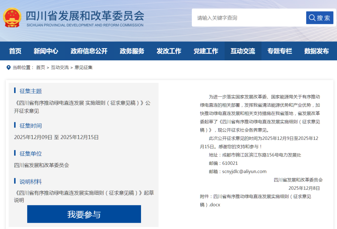 12月9日,四川省发展和改革委员会发布《四川省有序推动绿电直连发展实施细则(征求意见稿)》公开征求意见。征集时间为2025年12月09日 至 2025年12月15日。