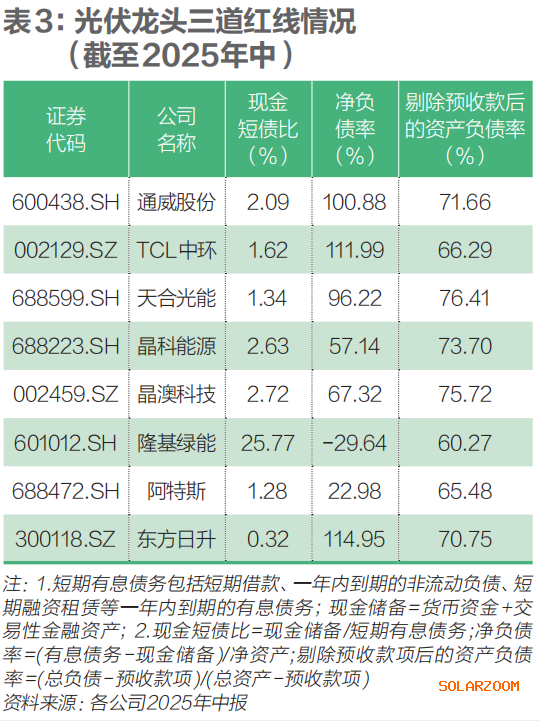 近年来,多数光伏行业龙头企业的资产负债率呈上升趋势,尤其是通威股份与晶澳科技。截至2025年上半年,两家企业剔除预收款后的资产负债率较2022年底分别上升22.36个和17.61个百分点,增幅居前。