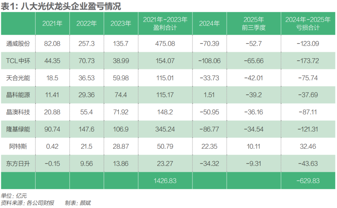 据《财经》统计,光伏八大龙头企业在2024年和2025年前三季度共亏损629.83亿元。此前三年(2021年—2023年)里,这八家企业共盈利1426.83亿元。业内认为,大部分企业积攒的利润仍可以承受当前的亏损。若让市场之手自行调节,光伏产业大规模去产能的时机尚未到来。