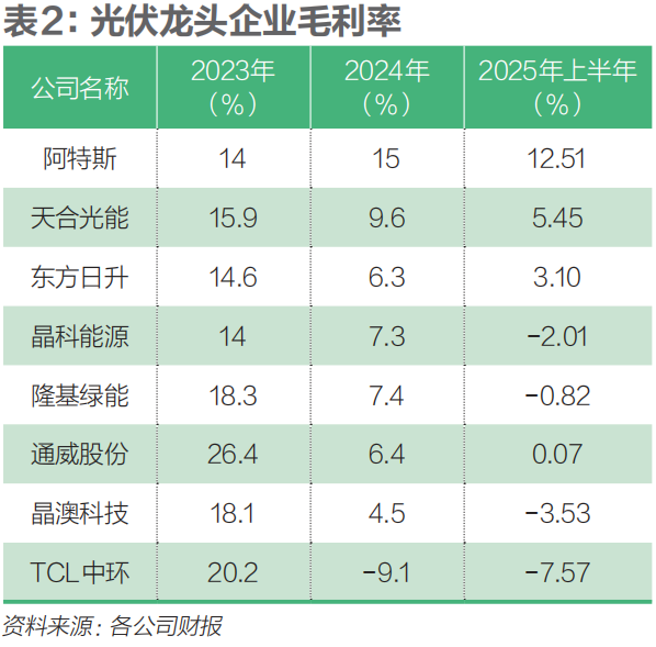 在2024年间,光伏行业对产能过剩的局势已然悉知,当时业界的主流观点是让市场来优胜劣汰。部分企业主动发起价格战,企图以低价占领市场,淘汰竞争对手。降价潮随即在光伏全行业蔓延,直至跌破成本线,光伏制造业陷入全线亏损。2024年,龙头企业里仅阿特斯和晶科能源微利,其余企业皆亏损。