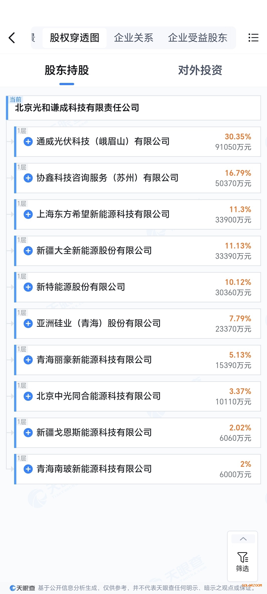 12月10日,记者通过天眼查搜索到光和谦成的股东信息,公司注册资本30亿元,其中最大股东为通威集团旗下的通威光伏科技(峨眉山)有限公司,持股比例30.35%。
