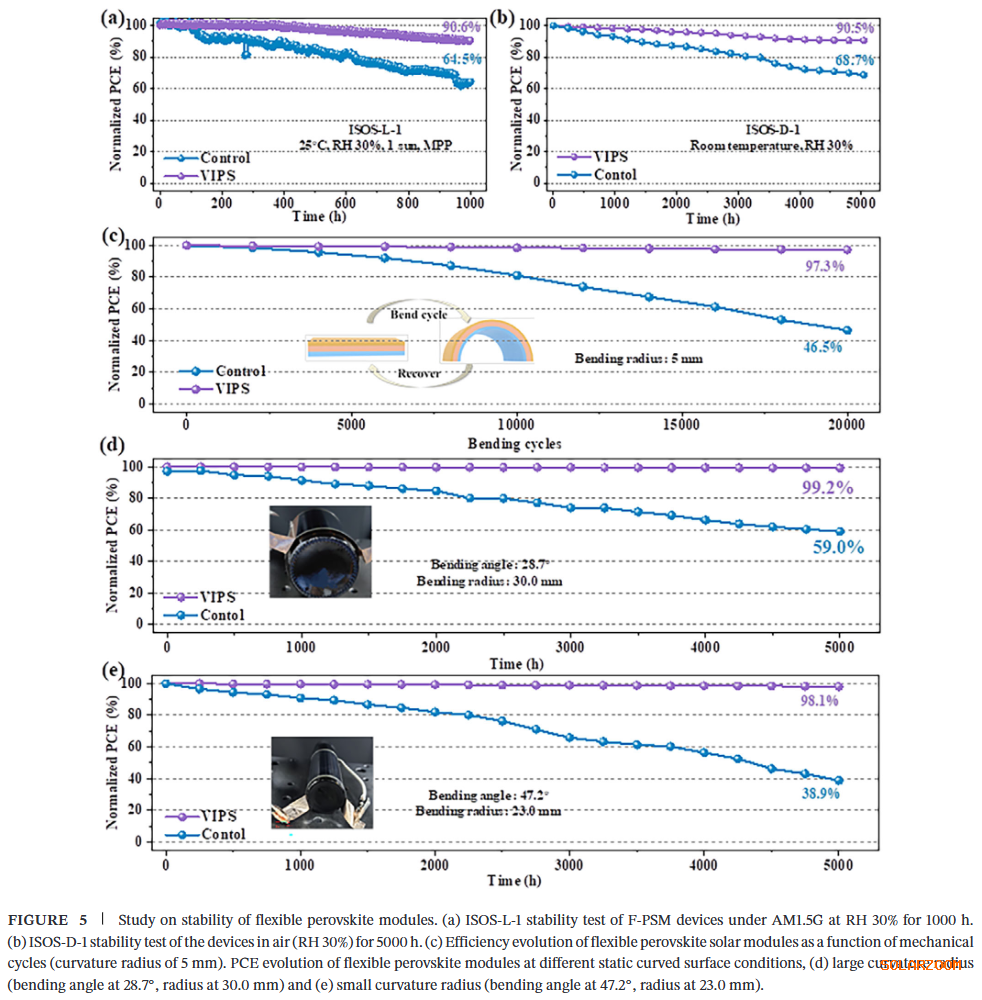 具备全面机械与环境稳定性,通过多项严苛测试器件在动态弯曲、静态大/小曲率变形、高湿强光等复杂条件下均保持高效稳定,ISOS-L-1与ISOS-D-1测试中效率保持率>90%,铅泄漏率显著降低,具备实际应用潜力。