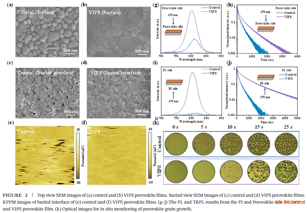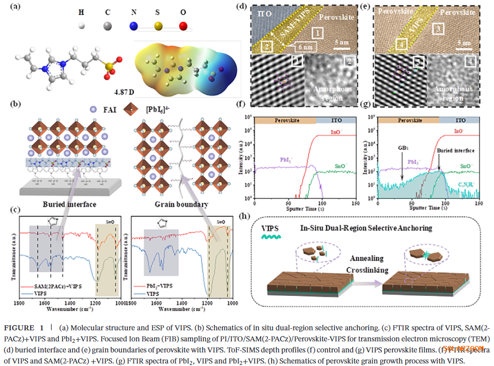 提出原位双区域锚定策略,精准强化应力集中区域利用VIPS分子中磺酸基与Pb²⁺的配位作用、咪唑基与界面材料的π共轭作用,实现其在钙钛矿晶界和埋底界面的选择性分布与聚合,形成柔性网络,有效释放多模式应力。