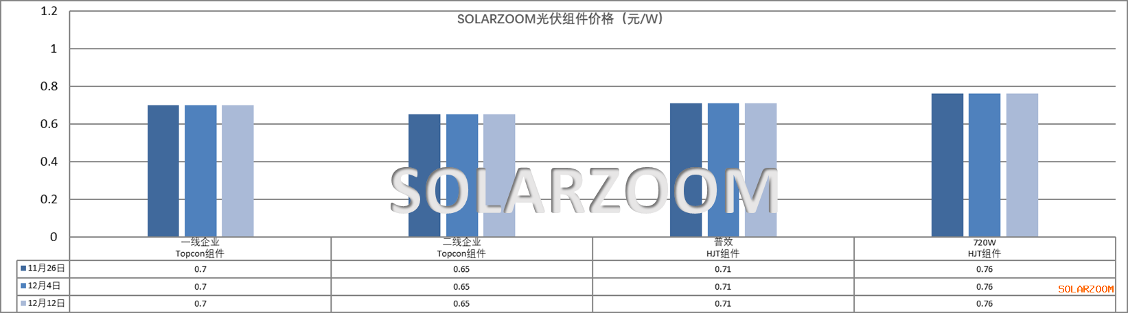 当前受国内年末将近以及季节、政策等因素影响,国内各类电站项目安装建设也进入收尾阶段;而海外双旦假期临近,对组件的采购需求也逐渐告一段落,结合国内外当前现状,国内组件的出货需求也是暂缓。价格方面,整体需求较为低迷的情况下,组件厂商对组件价格降价意义有限,因此上游硅片、电池近期持续的降价也未带动组件厂商报价松动,但组件市场一直存在价格分化仍在,常规功率组件价格0.63-0.66元/W的各类组件市场上继续流转出货;高功率组件价格头部组件企业继续坚挺在0.67-0.7元/W区间,甚至更高。排产上最后一个月组件厂商的排产计划也多为灵活,而在市场对明年一季度需求预期整体偏弱的情况下,预计整体排产下调的可能性较大。