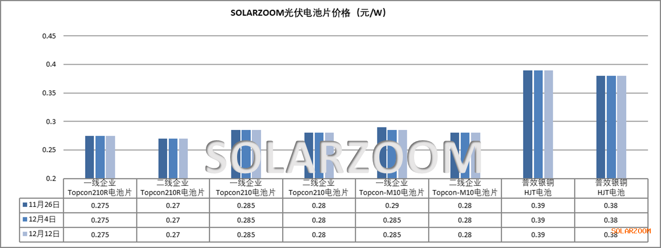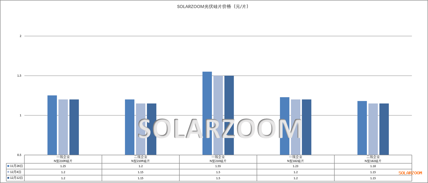 本周国内主流硅片价格变化不大,实际成交价格区间略有下移。本周各尺寸价格在成本压力下已几无下跌空间,因此本周M10L/G12R/G12硅片价格区尚落在1.15-1.2、1.2-1.25、1.48-1.5元/片内,市场实际成交趋于价格区间低位,同时1.13、1.18元/片等更低的价格也是偶有出现。年末终端需求退坡传导至硅片环节,下游环节减产导致硅片出货不畅,整体库存水平增加尤其是主流尺寸G12R硅片库存最为明显;此外上游硅料价格高位坚挺,成本不减,而售价的低迷,需求出货不畅,使得硅片企业经营压力进一步增加,本月国内市场硅片整体排产进一步下调,下调幅度环比预计达到13-15%区间。HJT硅片方面,本周HJT硅片随着常规大尺寸的下跌同步下滑,临近年底下游HJT产品需求有所起色,但成本压力下HJT电池环节复产较为谨慎,对应HJT硅片也暂未有明显起色。