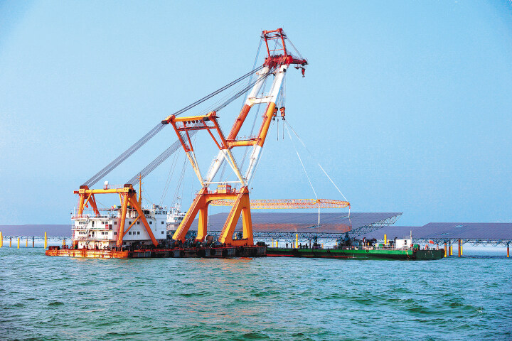 作业船正在项目现场吊装光伏网架。 记者 杨宽 摄