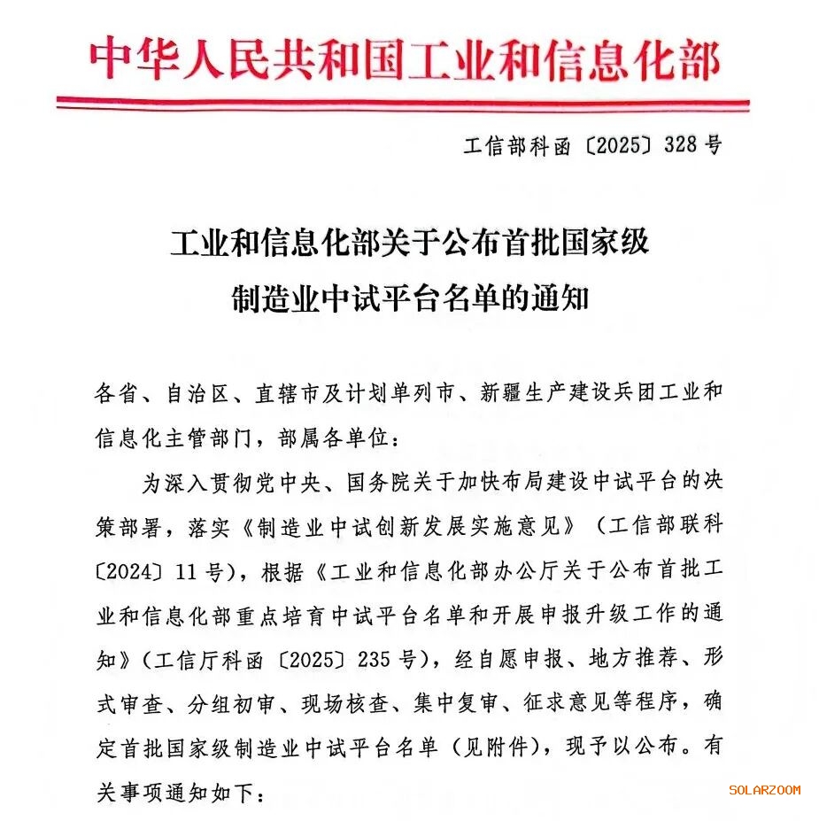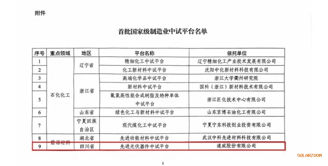 12月11日,工业和信息化部在辽宁省盘锦市召开了制造业中试创新发展座谈会,会议发布了首批国家级制造业中试平台名单。通威股份“先进光伏器件中试平台”成功入选,成为光伏行业唯一获此国家级认定的平台。此次评选在全国范围内进行,共有2400余家平台参选,入选率仅8.5‰。通威平台凭借在技术创新、基础能力建设、服务成效和成果转化方面的综合优势脱颖而出。