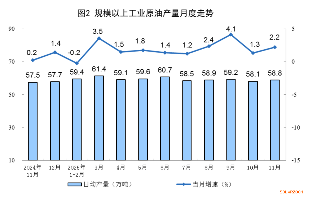 原油生产增速加快。11月份,规上工业原油产量1763万吨,同比增长2.2%,增速比10月份加快0.9个百分点;日均产量58.8万吨。