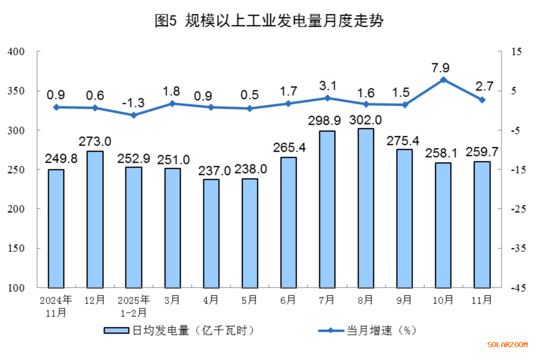 规上工业电力生产保持增长。11月份,规上工业发电量7792亿千瓦时,同比增长2.7%;日均发电量259.7亿千瓦时。1—11月份,规上工业发电量88567亿千瓦时,同比增长2.4%。