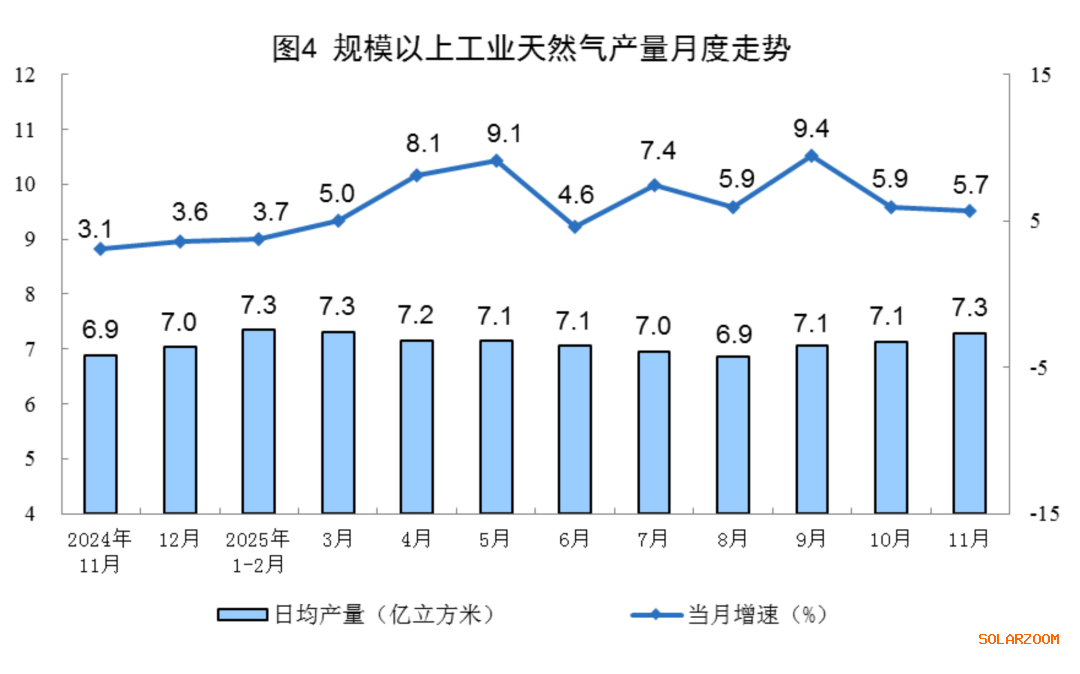 天然气生产稳定增长。11月份,规上工业天然气产量219亿立方米,同比增长5.7%;日均产量7.3亿立方米。