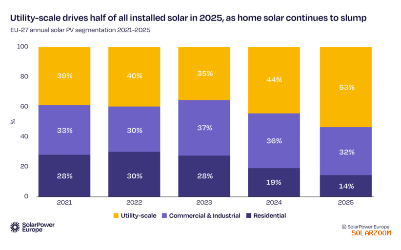 报告指出,2025年共有19个欧洲市场的户用光伏装机出现收缩,致使这一领域在欧洲太阳能行业中的占比降至14%,仅为能源危机高峰期2023年水平的一半。
