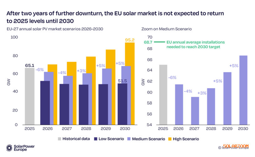 根据SolarPower Europe的中期预测方案,欧盟太阳能装机量预计将持续下滑两年,直至2027年才恢复个位数增长。而2025年的部署水平要到2030年才能重新达到。