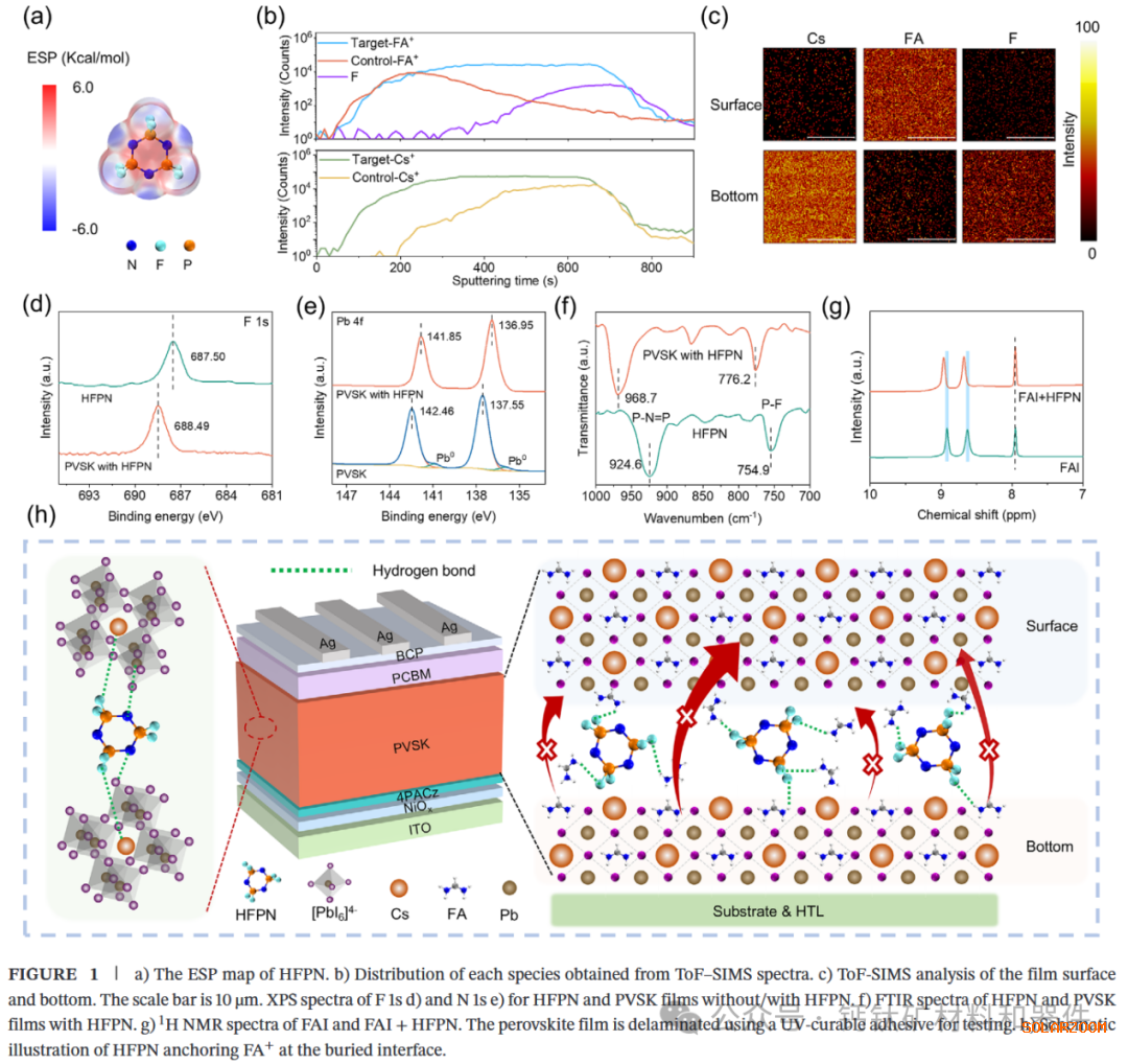 本工作引入高度电负性的六氟环三磷腈(HFPN)作为“底部锚定”分子,HFPN通过多氟结构与FA+上–NH–基团形成氢键,并与Pb2+发生配位,精准调控A位阳离子和无机骨架之间的相互作用。