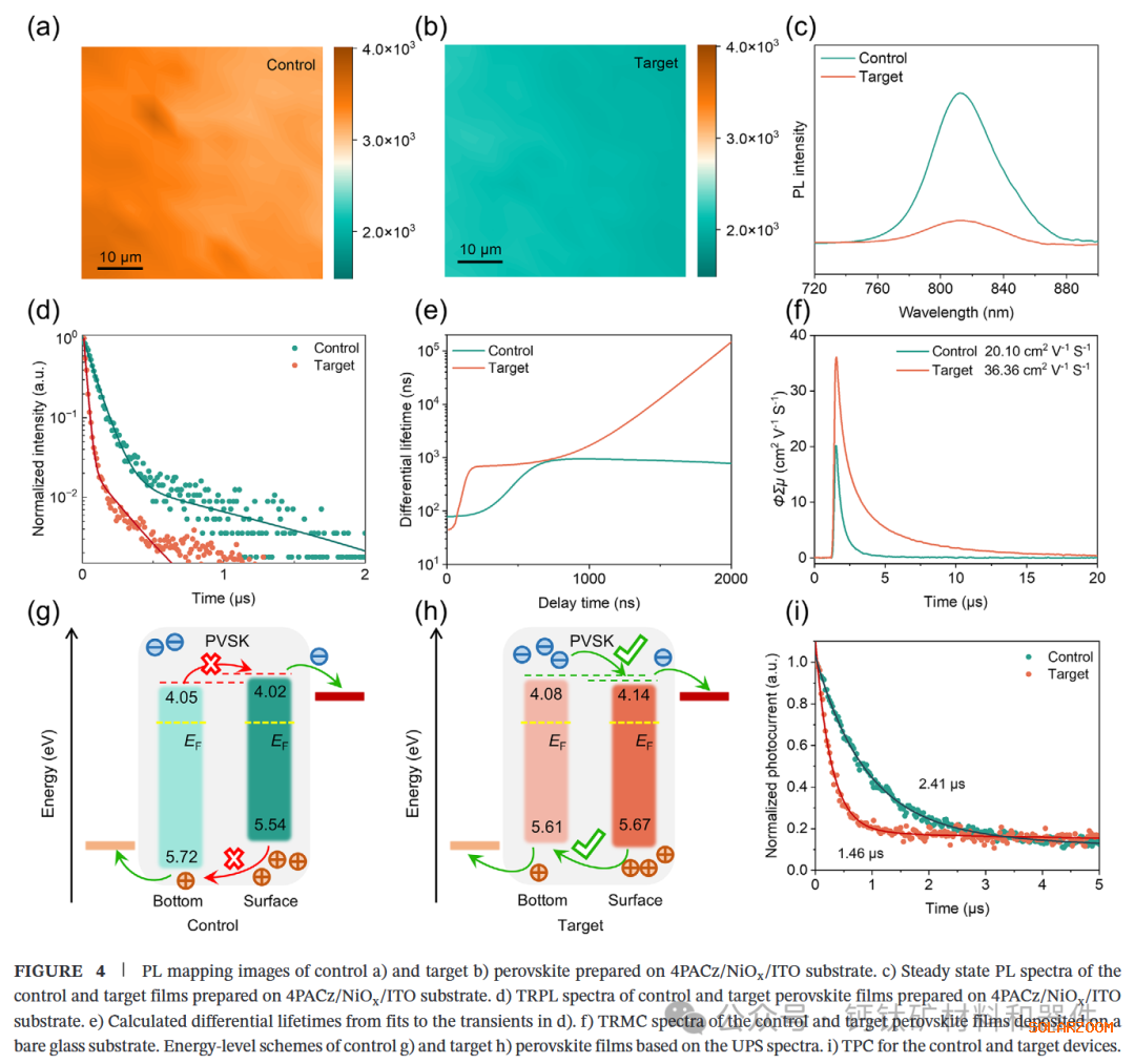 经过HFPN调控后的钙钛矿薄膜结晶度更高、表面粗糙度更低,界面和体相缺陷得到明显抑制。PL与TRPL结果显示,薄膜非辐射复合显著减少,平均载流子寿命明显延长,顶部与底部激发的发光峰几乎重合,印证了A位阳离子的均匀环境。SCLC测试表明陷阱态密度大幅下降,DFT计算也显示关键缺陷的形成能被明显抬升。