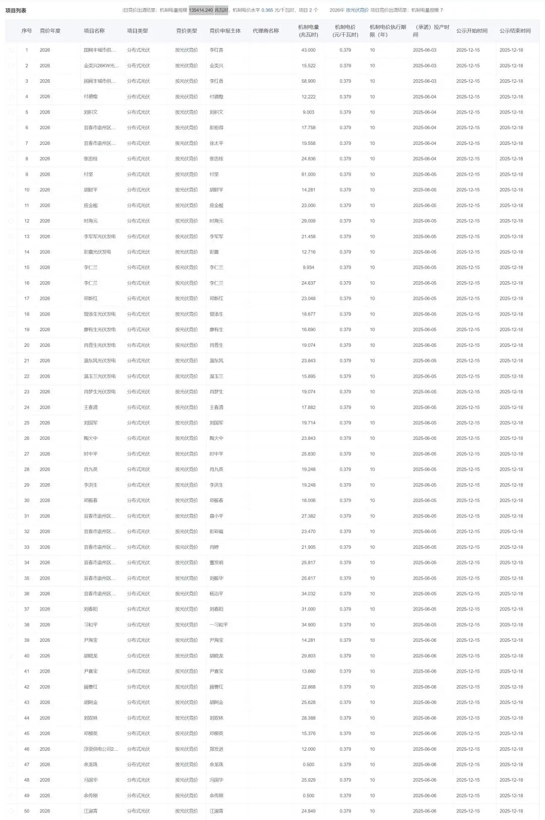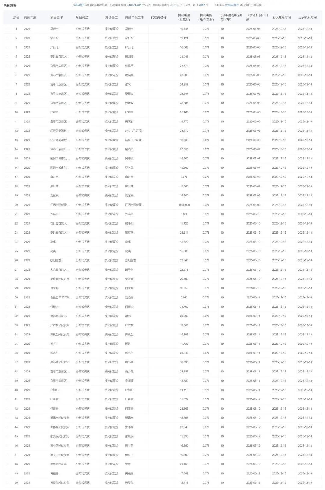 12月15日,国网新能源云公示江西省2026年风、光项目机制电价竞价结果,光伏0.379元/度,风电0.365元/度。