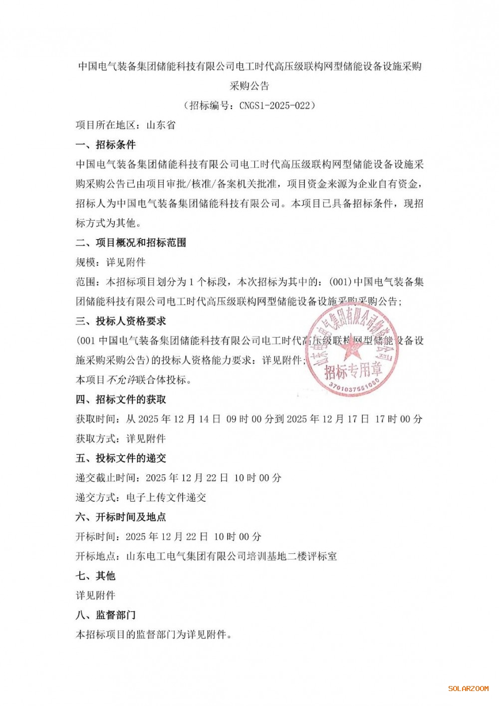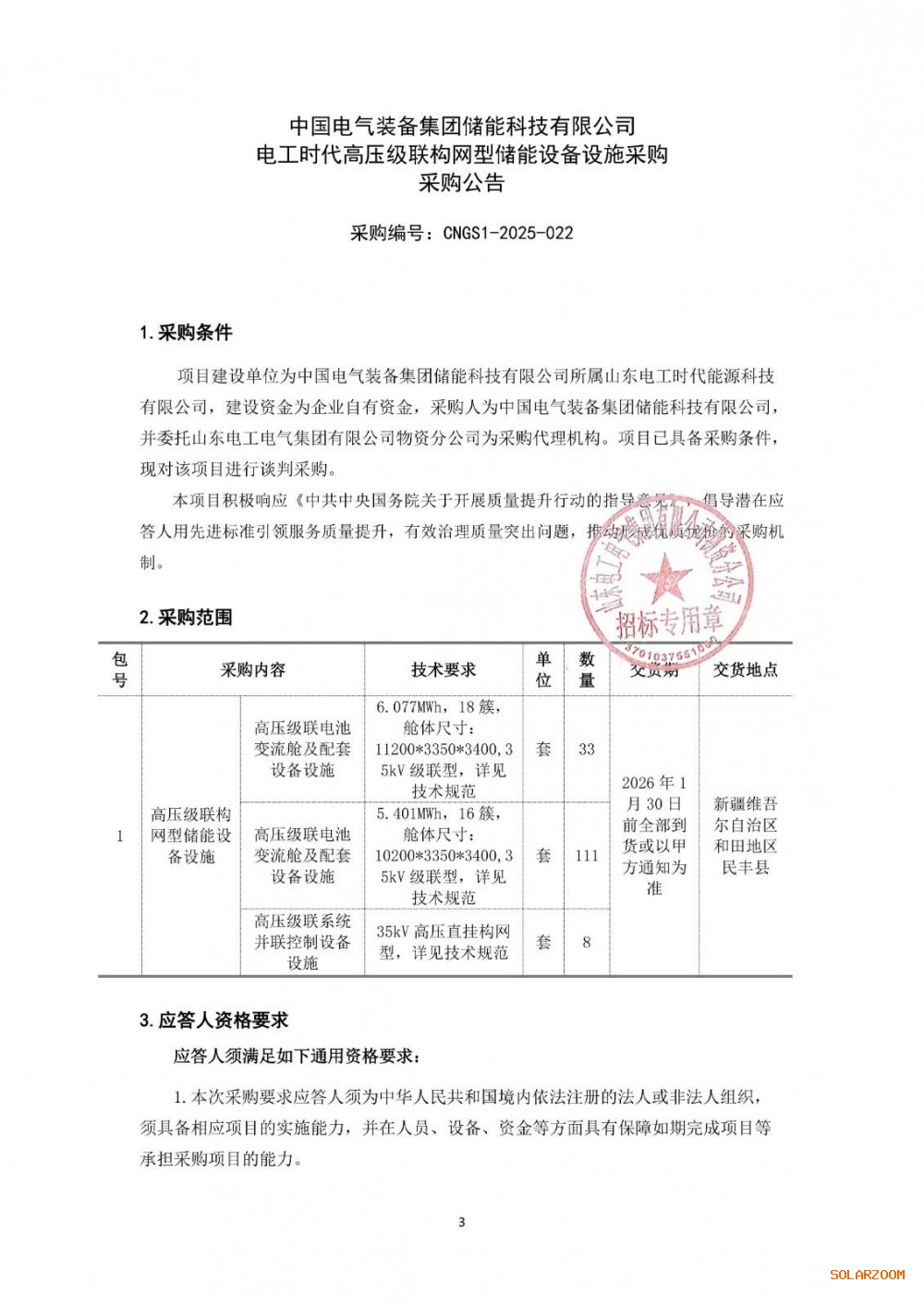 12月13日,中国电气装备集团储能科技有限公司电工时代高压级联构网型储能设备设施采购采购公告发布。项目共采购高压级联构网型储能设备约800MWh,其中规模为6.077MWh的设备33套、规模为200.541MWh,规模为5.401MWh的设备111套、规模为599.511MWh。