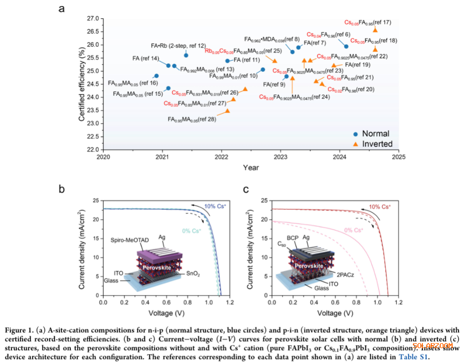 铯在倒置结构中关键作用:研究发现铯(Cs⁺)在倒置钙钛矿太阳能电池中能显著促进钙钛矿与空穴传输层之间的界面接触,而在正置结构中影响不大,揭示了结构依赖性的成分设计原则。