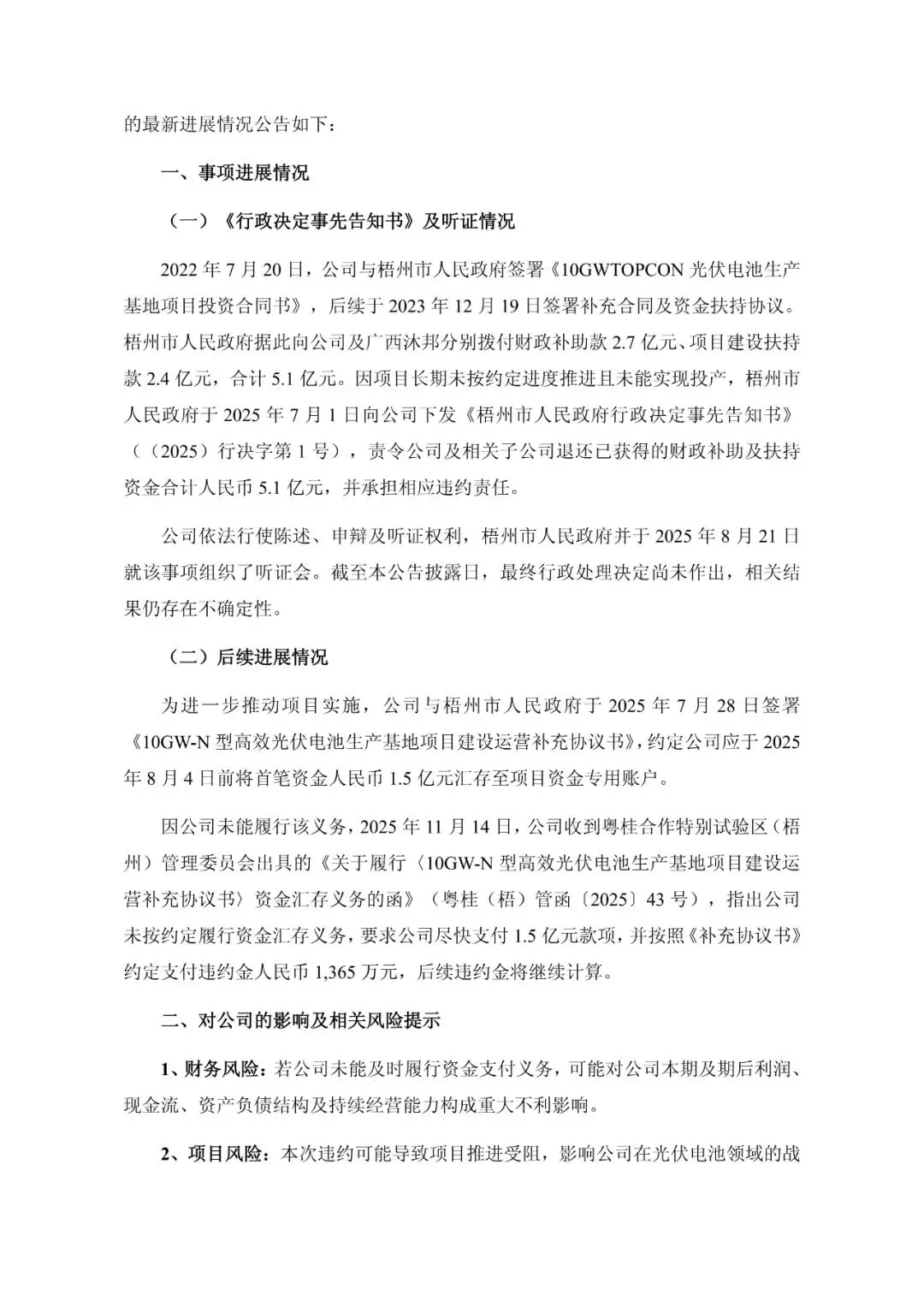 2025年11月14日,因公司未能履行该义务,公司收到粤桂合作特别试验区(梧州)管理委员会出具的《关于履行〈10GW-N型高效光伏电池生产基地项目建设运营补充协议书〉资金汇存义务的函》,指出公司未按约定履行资金汇存义务,要求公司尽快支付1.5亿元款项,并按照约定支付违约金人民币1365万元,后续违约金将继续计算。