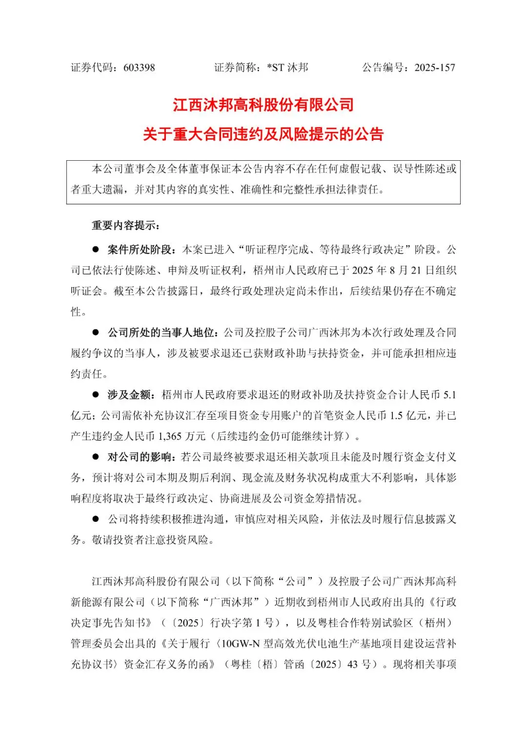 12月20日,江西沐邦高科股份有限公司发布《关于重大合同违约及风险提示的公告》。