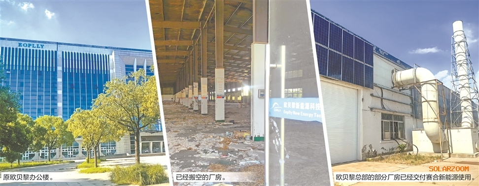 海安市黄海西路188号,欧贝黎在这里打造的“光伏王国”,如今已经“归零”。证券时报记者在现场看到,已经搬空的厂房内,依稀能看到欧贝黎的字样,露出红砖的墙上,还挂着南通市时任领导参加奠基仪式的照片。