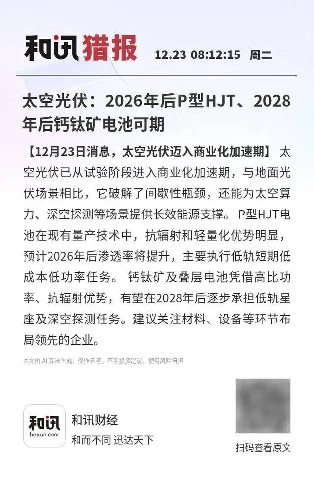 太空光伏已从试验阶段进入商业化加速期,与地面光伏场景相比,它破解了间歇性瓶颈,还能为太空算力、深空探测等场景提供长效能源支撑。P型HJT电池在现有量产技术中,抗辐射和轻量化优势明显,预计2026年后渗透率将提升,主要执行低轨短期低成本低功率任务。钙钛矿及叠层电池凭借高比功率、抗辐射优势,有望在2028年后逐步承担低轨星座及深空探测任务。建议关注材料、设备等环节布局领先的企业。