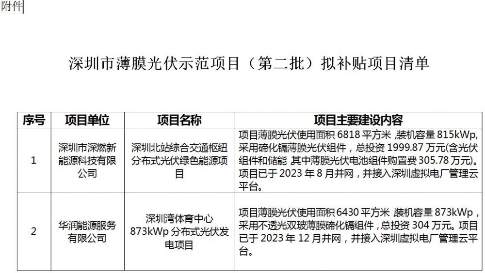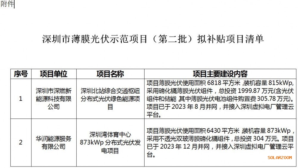 12月19日,深圳市发改委发布关于公示深圳市薄膜光伏示范项目(第二批)拟补助项目清单的通告。