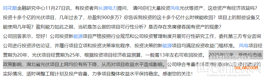 对于增量项目,在136号文的政策导向下,“不挣钱就及时止损”成为长源电力的投资准则。参照长江电力相关测算,风电项目经营期为20年,光伏项目经营期为25年,根据投资项目经济收益测算,一般需13年左右可收回投资。2025年以来,受电价市场政策影响,湖北省光伏项目上网均价有所下降,从而对项目收益水平造成影响。