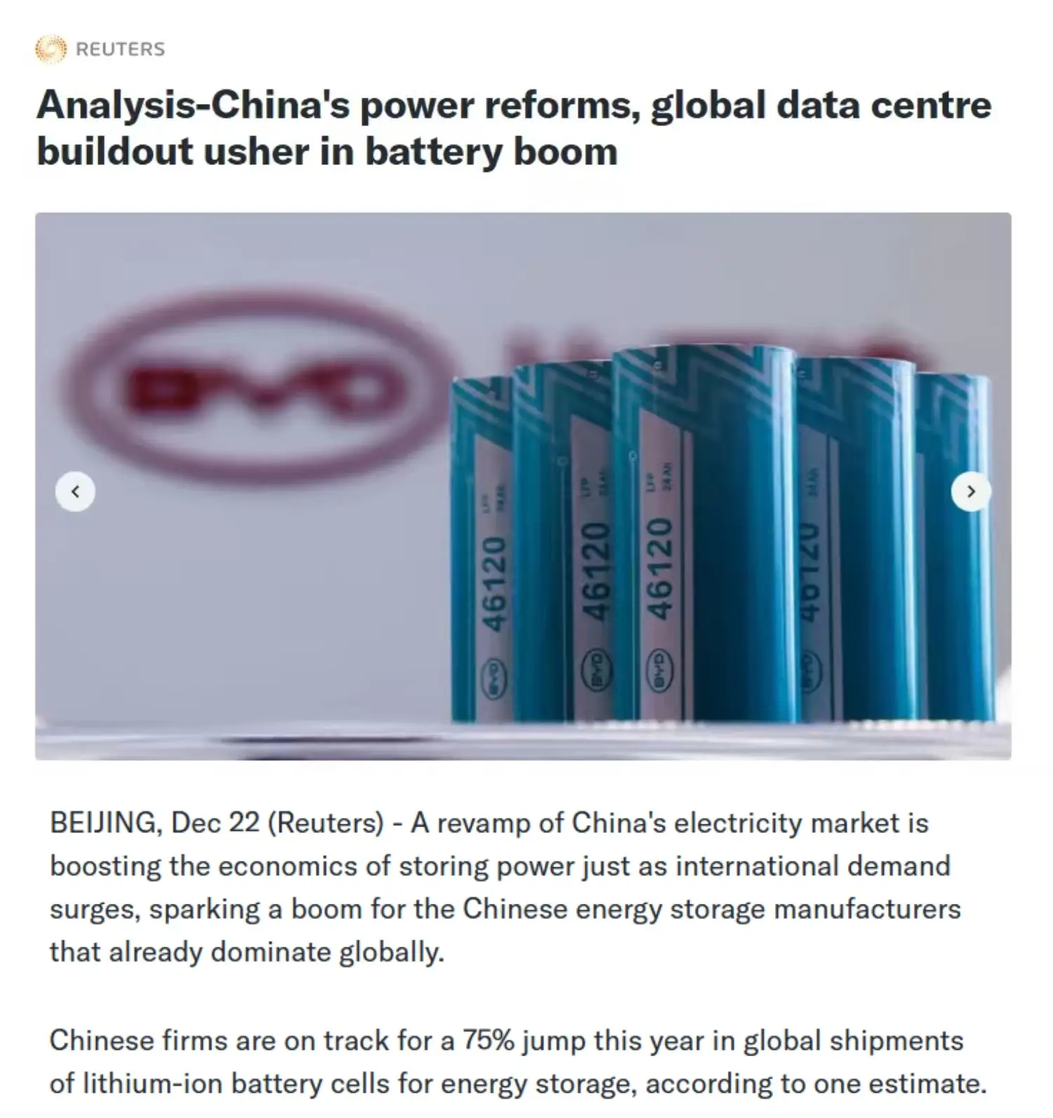 文章说,据行业测算,今年中国企业在全球储能锂离子电池出货量预计将猛增75%。今年以来,中国出口的储能电池与电动汽车电池总额再创新高,进一步巩固了其在支撑风光发电并网、保障人工智能数据中心电力稳定等关键领域的主导地位。