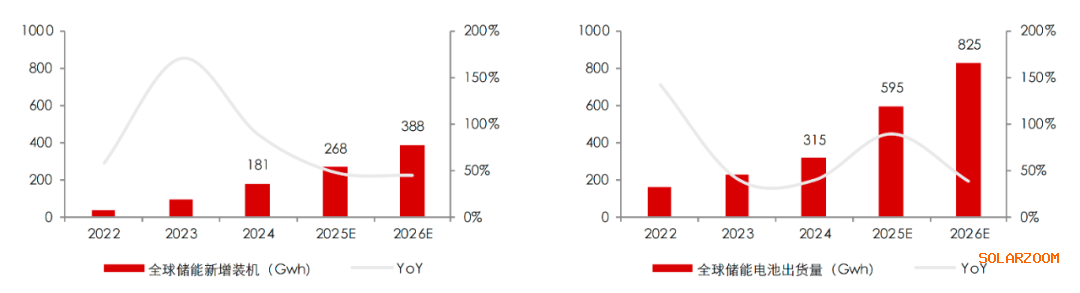 机构预测,从新增装机口径来看,2026年全球储能新增装机有望达到388gwh,同比增长45%;从出货量口径,2026年全球储能电池出货量或达到825gwh,同比增长39%。