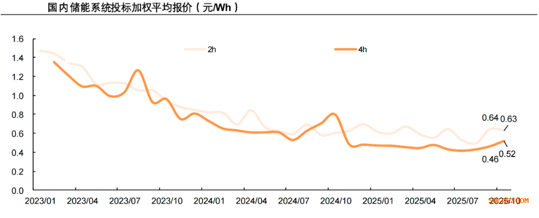根据储能与电力市场、寻熵研究院统计,2025年9月,国内2h储能系统加权平均报价0.64元/Wh,环比快速增长31%;10月,2h系统平均报价0.628元/Wh,环比略降2%,价格整体改善。9月、10月,4h储能系统平均报价分别为0.46/0.52元/Wh,环比分别上涨8%和12%。