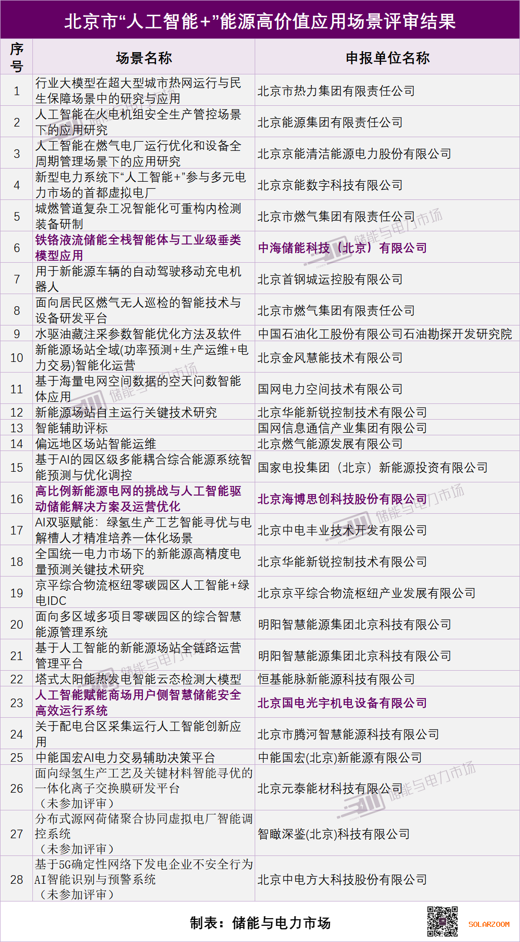 通过召开专家评审会审议后确定了评审结果,北京市“人工智能+”能源高价值应用场景评审结果公示了28个场景。其中涉及储能相关场景3个,分别为: