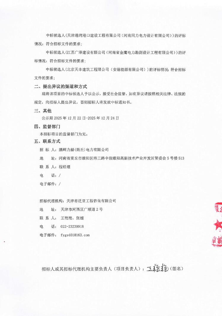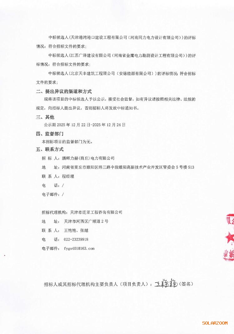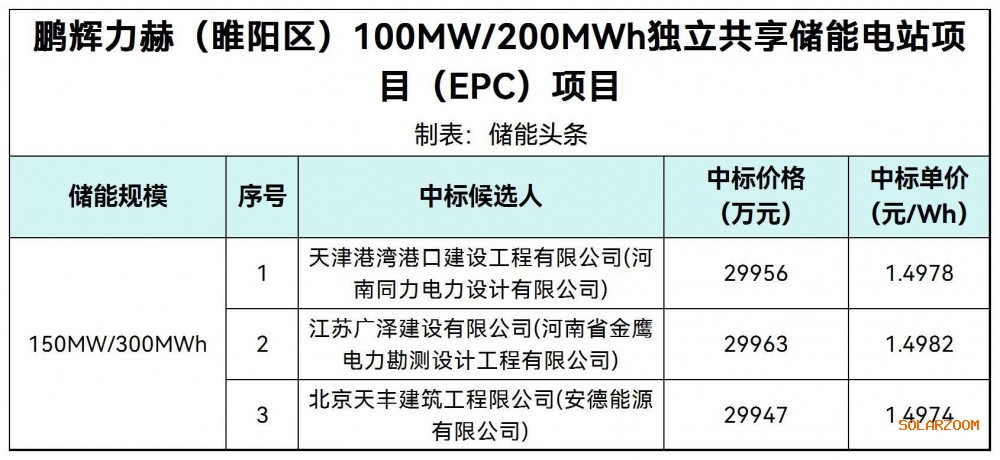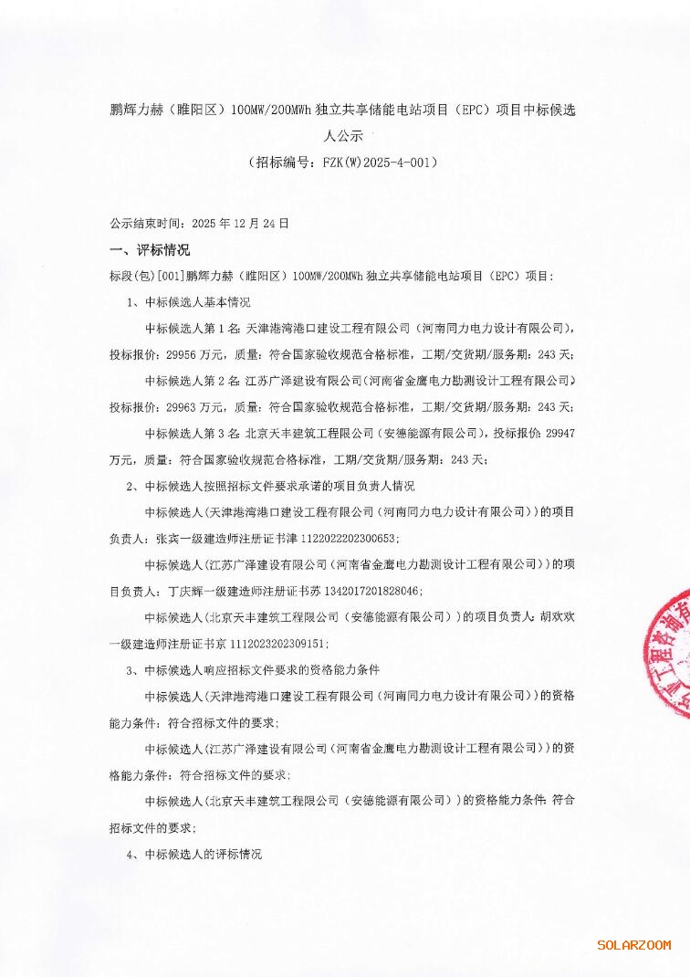 第一中标候选人为天津港湾港口建设工程有限公司、河南同力电力设计有限公司联合体,投标报价为29956万元,折合单价1.4978元/Wh;第二中标候选人为江苏广泽建设有限公司、河南省金鹰电力勘测设计工程有限公司联合体,投标报价为29963万元,折合单价1.4982元/Wh;第三中标候选人为北京天丰建筑工程限公司、安德能源有限公司联合体,投标报价为29947万元,折合单价1.4974元/Wh。