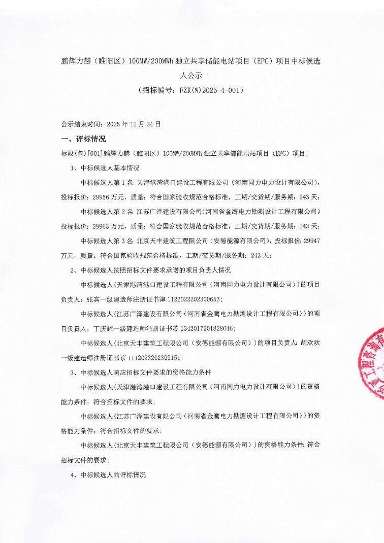 12月22日,鹏辉力赫(睢阳区)100MW/200MWh独立共享储能电站项目(EPC)项目中标候选人公示。