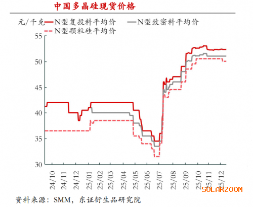 在新产能投放节奏放缓与库存加速消化的双重作用下,多晶硅价格已由2025年7月初最低的35元/kg快速回升至50元/kg以上,初步显现出产能调控的积极效果。