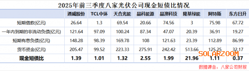 2025年前三季度,在八家光伏龙头中,除了东方日升现金短债比仅有0.37外,其他企业都在1以上,短期财务状况较为安全。