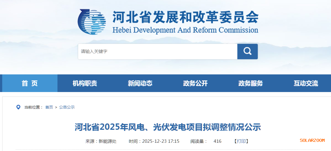 12月23日,河北省发展和改革委员会发布《河北省2025年风电、光伏发电项目拟调整情况公示》。