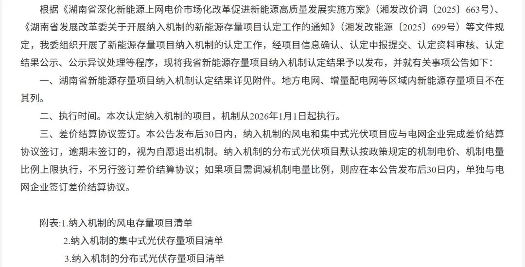 12月31日,湖南省发展和改革委员会下发关于发布湖南省新能源存量项目纳入机制认定结果的公告。