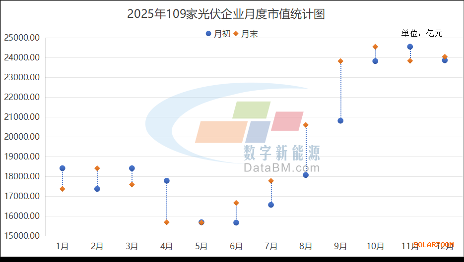 放眼全年,从各月度市值统计情况来看,统计的109家光伏上市企业1-5月的市值整体呈现下降趋势,并在5月达到一年的底部时刻;6月末受到国家光伏行业“反内卷”行动的影响,整体市值开始回暖,并在“反内卷”行动的持续积极推进之下,7-9月市值出现明显的快速上升,且增幅逐步扩大;10-12月市值增速明显放缓,甚至出现回落的“苗头”,这或许是与终端需求疲软有关。