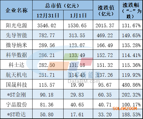 统计范围109家光伏上市企业中,有79家企业年末市值相较年初出现增长。其中有10家企业市值增幅超过100%,国晟科技(19.130. 1.53. 8.69%)以480.86%的增幅成为市值涨幅最大的光伏企业。据行业统计,该公司在11月份获得了11个涨停板,被称为光伏“妖股”。