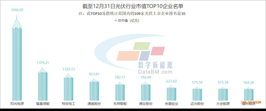 其中阳光电源以3546.02亿元的市值断层第一,隆基绿能和特变电工市值也在“千亿队伍”之中。