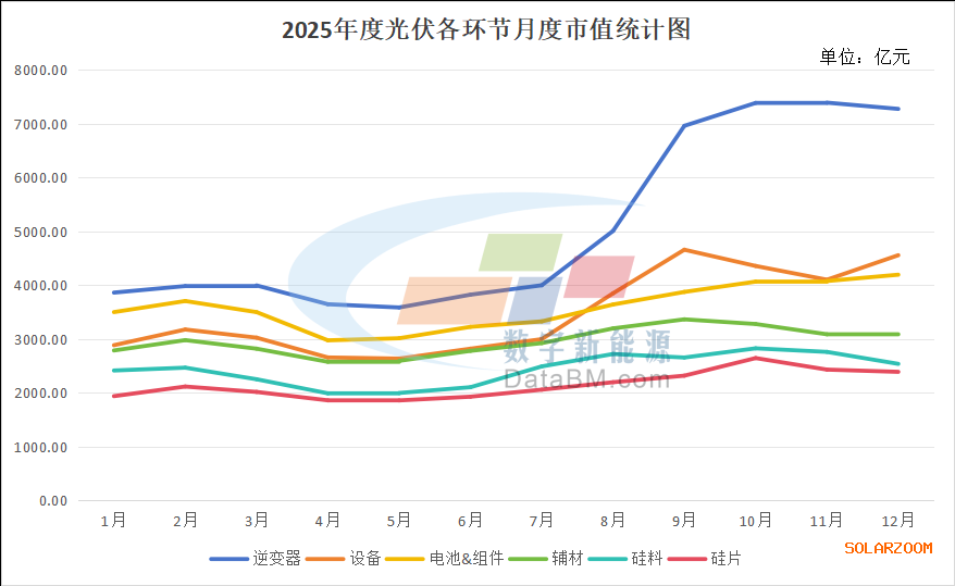 从各环节的月度市值变化情况来看,与上述企业月度市值变化整体较为吻合,单个环节节点变化有所区别。例如:设备环节在9月市值达到一年中的最高点,此后便开始下降,但在12月再次反弹;硅料环节则在10月达到了一年市值的最高点,此后该环节市值则逐步回落。