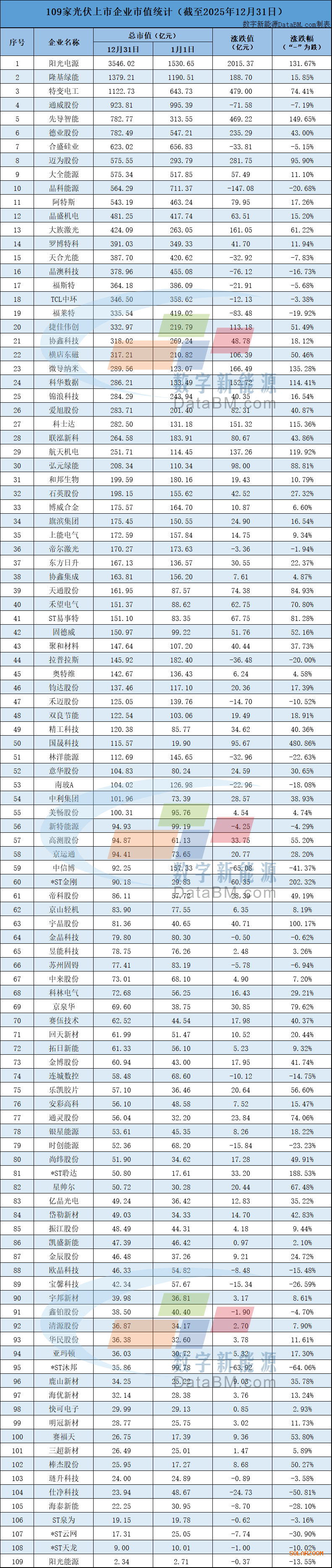 整体来看,截至2025年12月31日,统计范围的109家光伏上市企业总市值达到24.044.15亿元,与开年相较增长了5628.40亿元,增幅达30.56%;与6月1日的总市值相较则增长了8375.14亿元。