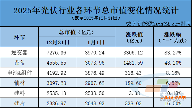 从生产环节来看,除硅料环节之外,其余各环节12月的总市值相比年初均有所增长。其中逆变器、设备环节增长幅度位居前二,分别达到83.27%、48.2%;硅片环节以16.5%的增速位居第三,成为主产业链环节增速最快的环节;电池组件和辅材环节增速则居于5%-10%;硅料环节相较年初则有所下降,降速为0.13%。