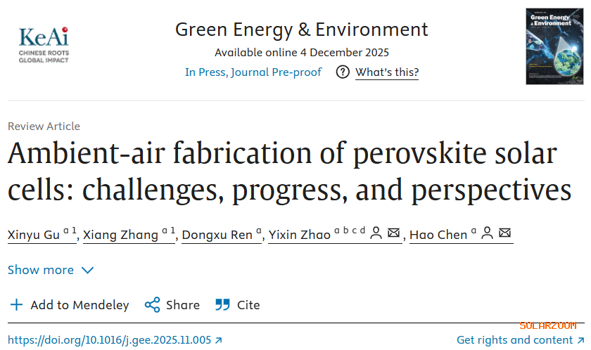 近日,上海交通大学溥渊未来技术学院未来光伏研究中心陈昊副教授、赵一新教授于《绿色能源与环境》 (Green Energy & Environment)上发表最新综述“Ambient-air fabrication of perovskite solar cells: challenges, progress, and perspectives”。陈昊课题组2025级博士生顾欣宇和博士后张祥为论文的共同第一作者。该综述得到了国家自然科学基金、上海交通大学启动基金和上海市浦江人才项目的支持。