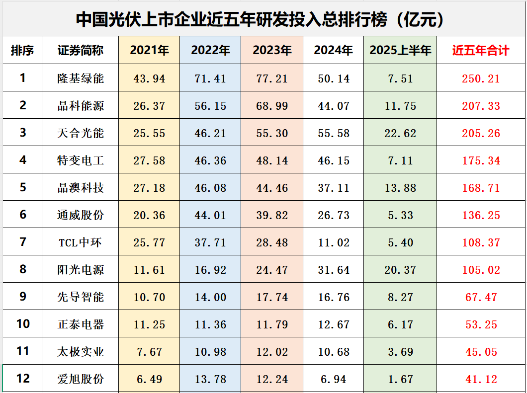 黑鹰统计发现,从2021年至2025年上半年,135家光伏上市企业累计研发投入达2593亿元。其中2021年为404亿元,2022年为642亿元,2023年为710亿元,2024年有所下降至613亿元,2025上半年,囿于产业寒冬与企业经营压力,整体研发投入有所下降至224亿元。从不同企业的整体研发投入力度观察,从2021年至2025年上半年,累计研发投入最多是隆基绿能,这家龙头近五年以250亿的投入名列第一。其后依次是晶科能源207亿元,天合光能205亿元,特变电工175亿元,晶澳科技169亿元,通威股份136亿元,TCL中环108亿元,阳光电源105亿元。其中,排在前10的企业的研发投入占135家企业整体投入的57%。
