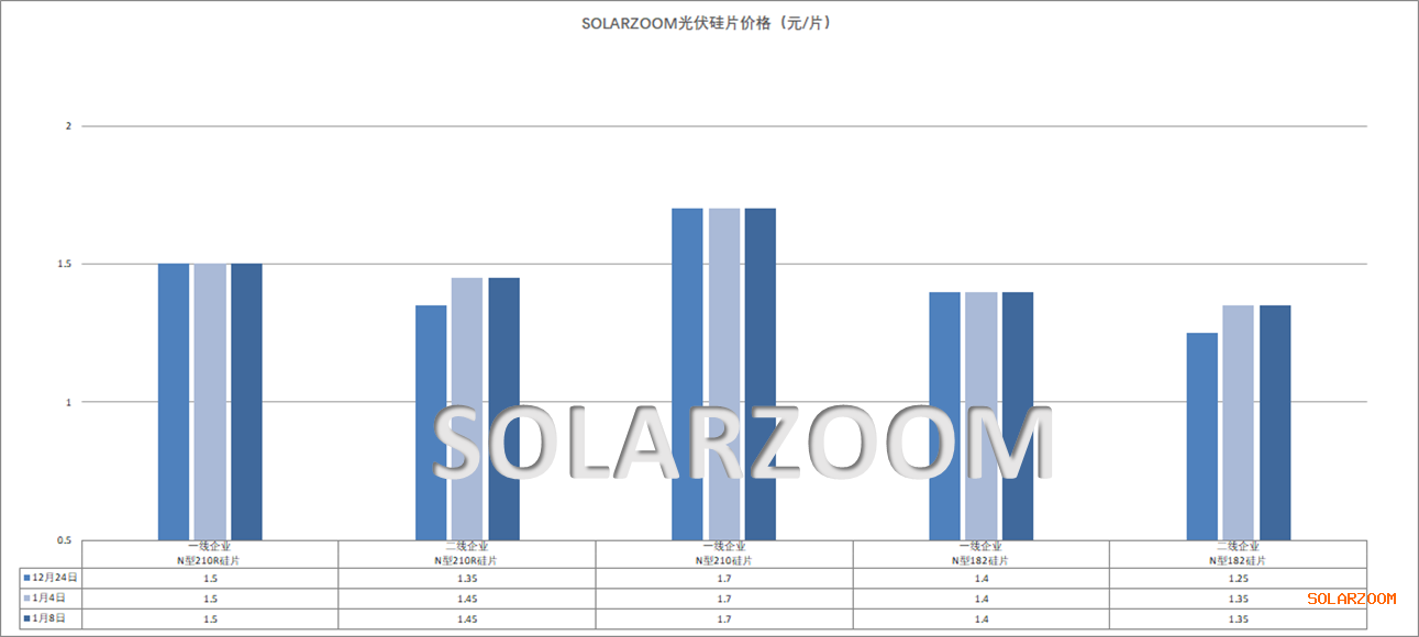 元旦节前三种尺寸硅片分别涨价到1.4、1.5、1.7元/片,节后上来各尺寸硅片价格高位维稳,暂未有明显波动,当前N型M10L、G12R、G12硅片价格分别落在1.35-1.4、1.45-1.5、1.65-1.7元/片区间,上下游均大涨的情况下硅片企业挺价意愿明显,前期的低价订单陆续暂停发货,新价格的订单本周陆续有成交;但值得注意的是下游电池端排产下调明显,对应各尺寸硅片需求也进一步下滑,市场上整体硅片库存处于增加中。HJT硅片方面,下游HJT电池整体开线不高,对应HJT硅片需求较低,而市场在产的HJT硅片企业寥寥,因此HJT硅片相比同尺寸Topcon硅片价格溢价明显,HJT半片报价价格上涨至0.82-0.84元/片左右。