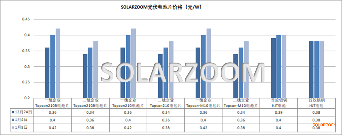 近期国内银价19000元/公斤附近高位震荡,电池端成本居高不下,N型Topcon电池价格从0.3元/W开始一路调涨幅度达到0.1元/W左右,元旦节前开始国内主流电池厂商的各尺寸电池价格已站上0.4元/W,本周头部电池企业高位报价涨至0.42元/W,但与下游尚在博弈,成交较少,当前各尺寸主流成交价格0.38-0.4元/W区间。此轮价格上涨主要为银价暴涨推动,同时上游硅片价格的上涨也对电池价格起到了推波助澜的作用;但当前下游对应需求却处于淡季中,甚至大幅跳涨的电池价格使得对应电池需求进一步观望萎缩,因此成本倒挂、需求下滑的双重压力下,本月包括头部电池企业在内整体电池端排产下滑明显,且随着年关电池排产预计将进一步下调。HJT电池方面,N型HJT电池市场产出有限,不同企业间差距明显,满产以及停产同时存在,HJT电池报价随市上涨,但下游对涨价的HJT电池接受度有限,当前HJT电池接受价格维持在0.37元/W左右,价格与Topcon电池价格差距明显缩小,甚至有倒挂。